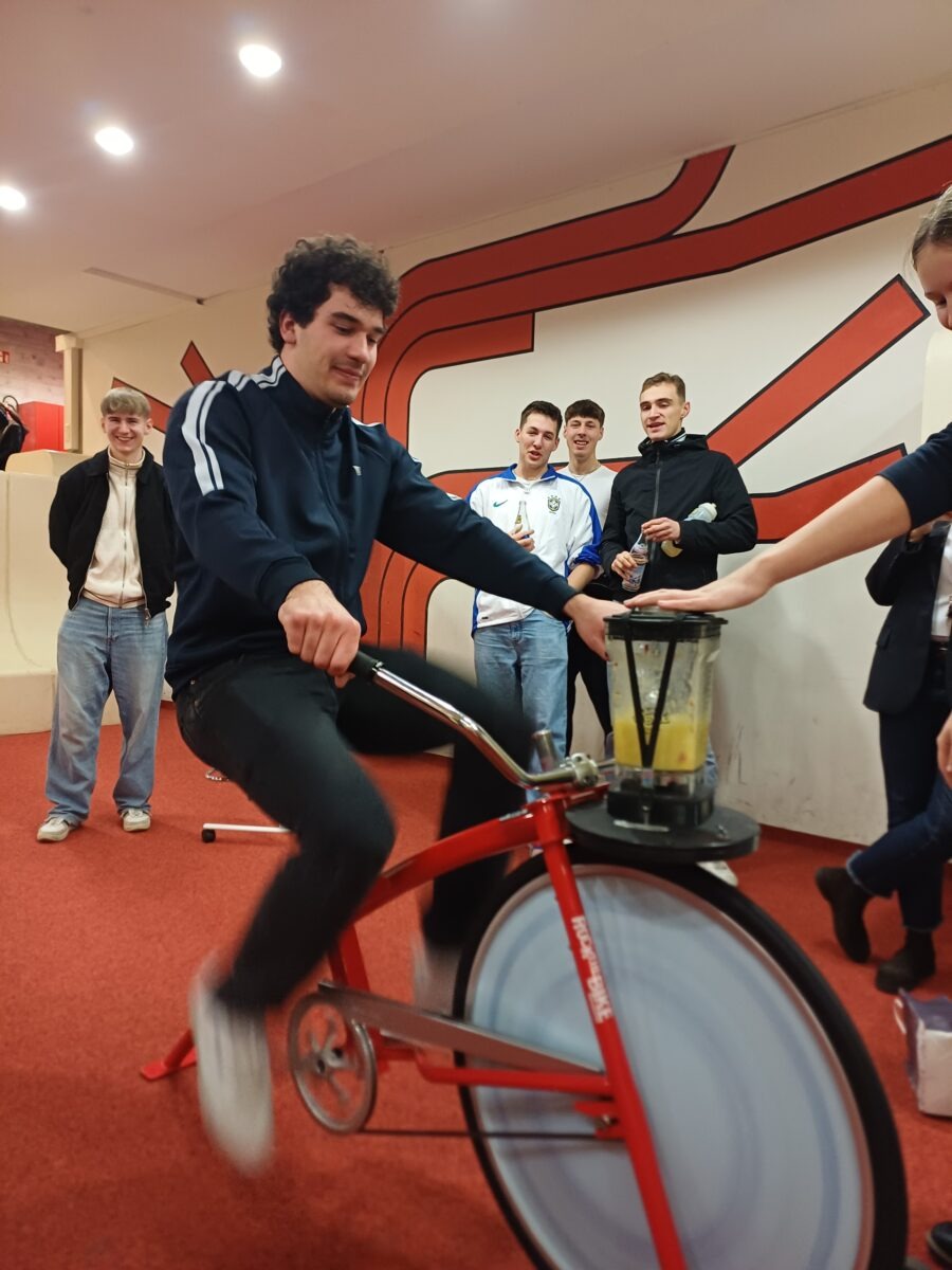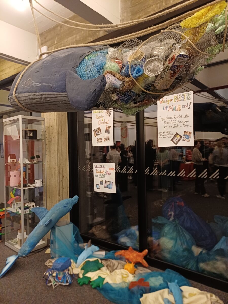 Ein Wal aus Müll schwebt von der Decke, daneben steht ein verdrahtetes Fahrrad, mit dem sich ein Smoothie aus eigener Muskelkraft erstrampeln lässt. Auf Tabletts wird Fair-Trade-Schokolade zur Verkostung gereicht. Der Auftakt zum Projekttag „Klimaschule“ setzt bewusst auf starke Bilder und sinnliche Erfahrungen – und auf bleibende Eindrücke rund um Nachhaltigkeit, Biodiversität und Umweltschutz.