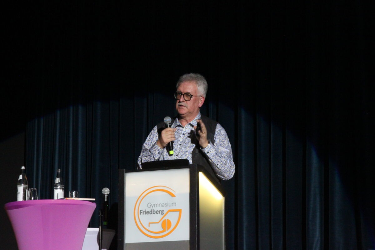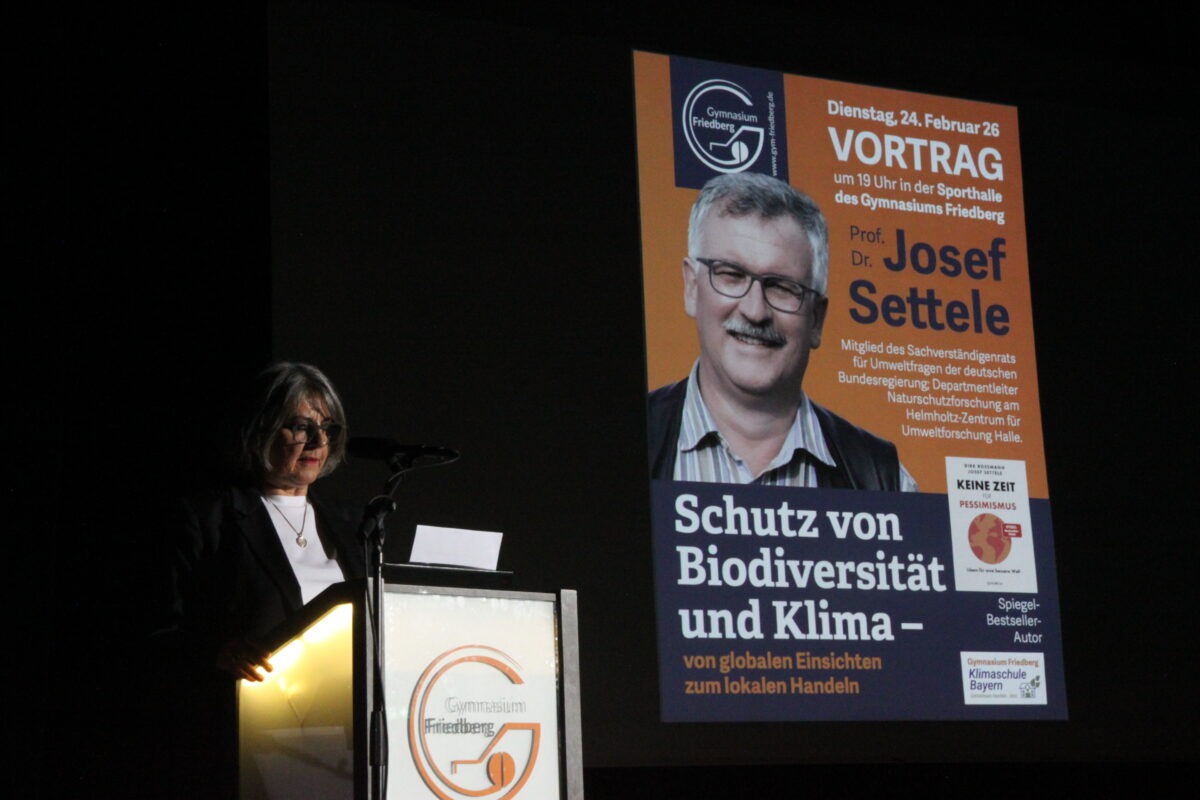 Höhepunkt des Abends war der Vortrag von Prof. Dr. Josef Settele. Der Wissenschaftler am Helmholtz-Zentrum in Halle an der Saale, einst als „Sepp aus Marktoberdorf mit seiner Schmetterlingssammlung“ als Mitschüler der Schulleiterin bekannt, ist heute internationaler Experte für Agrarwissenschaften und Ökologie. In seinem Vortrag „Schutz von Biodiversität und Klima – von globalen Einsichten zum lokalen Handeln“ spannte er den Bogen von weltweiten Verhandlungen bis hin zur kommunalen Ebene. Mit auf dem Podium: Bürgermeister Roland Eichmann sowie Ministerialrat Philipp Pacius vom Bayerischen Staatsministerium für Unterricht und Kultus.