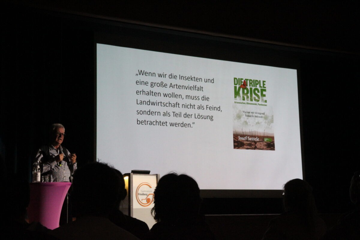 Settele, Autor des Bestsellers Keine Zeit für Pessimismus, berichtete aus seiner Arbeit als Sachverständiger für die Bundesrepublik Deutschland und in internationalen Staatengruppen. Seine Motivation sei klar: „Die beteiligten Staaten können nicht mehr behaupten, sie hätten von der brenzligen Lage nichts gewusst.“ Sein besonderes Augenmerk gilt der Biodiversität. Der Mensch, so Settele, sei in seiner Existenz fundamental auf Artenvielfalt angewiesen.