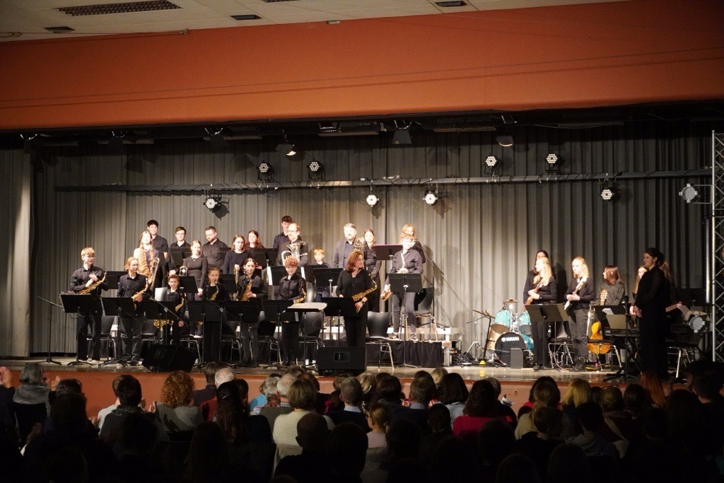 Mit „Crazy Train“ von Rock-Legende Ozzy Osbourne eröffneten die 31 hochmotivierten Musikerinnen und Musiker den Abend und ließen die Turnhalle des Gymnasiums beben. Mit Klassikern wie „Funkytown“, „Birdland“ und „Watermelon Man“ sorgte die Band unter der Leitung von Maria Spicker mit groovigen Songs für eine ausgelassene Stimmung.