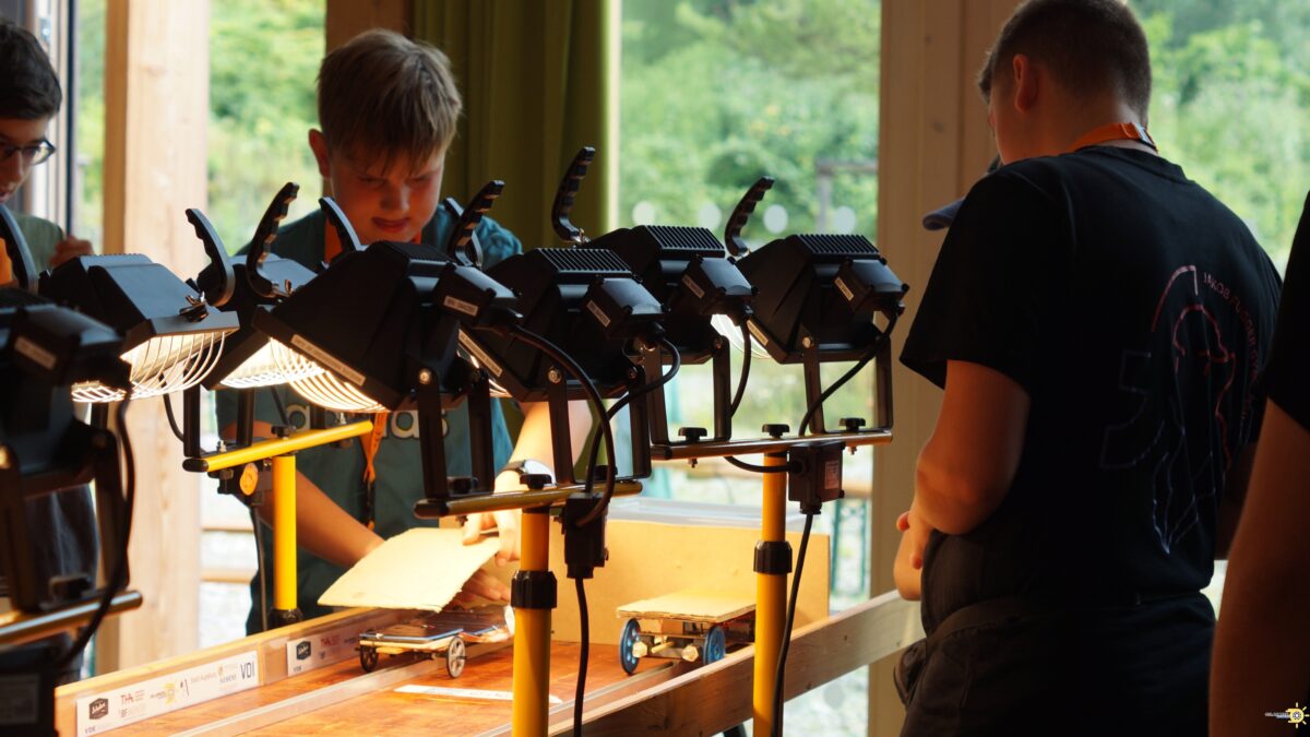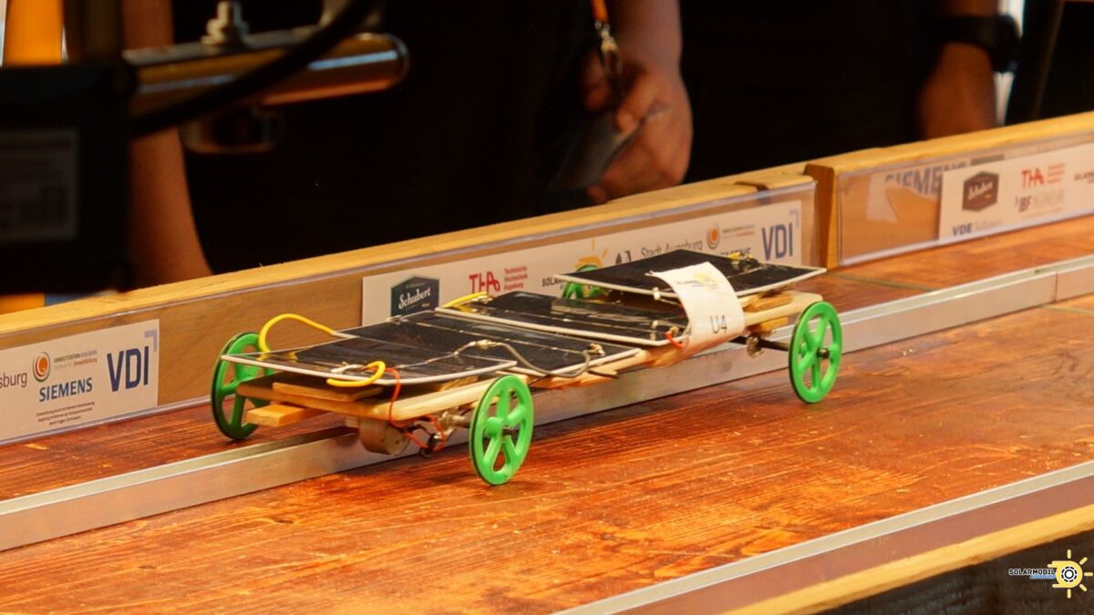 Im Wettbewerb galt es dann die fünf Meter lange Fahrstrecke entlang einer Führungsschiene einmal vorwärts und wieder zurück möglichst schnell zurückzulegen – mit Licht als einziger Energiequelle.