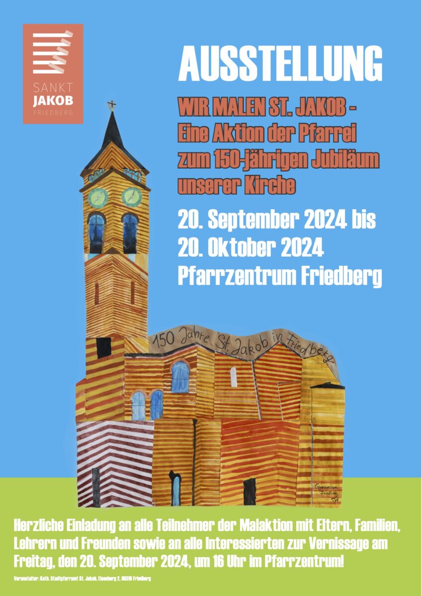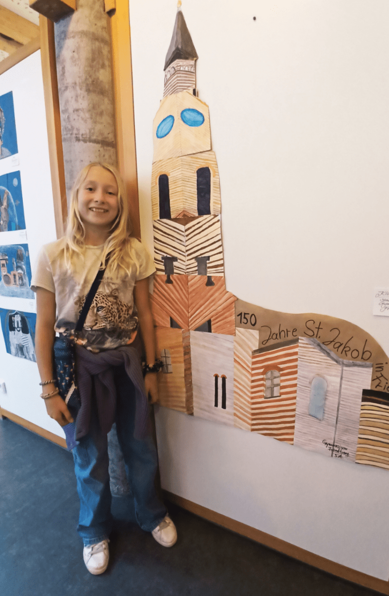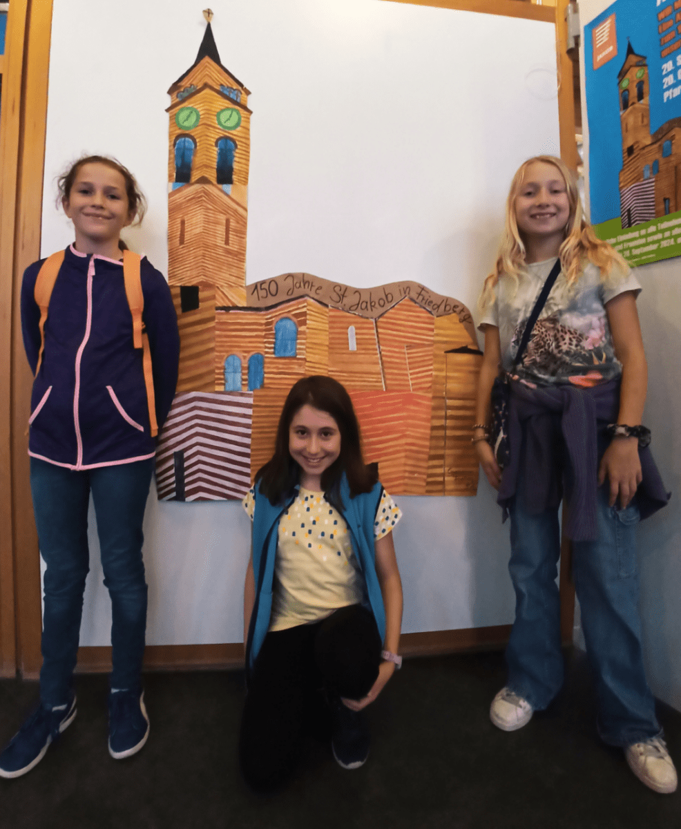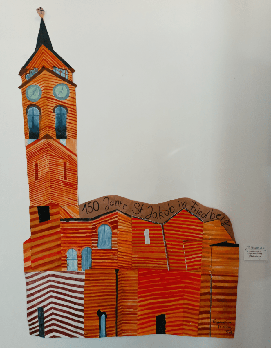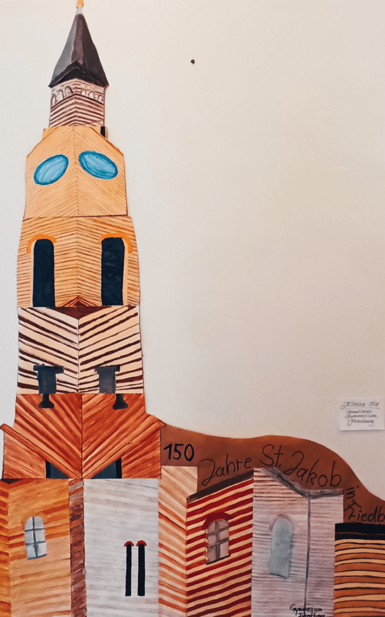 Die Klasse 5a (jetzt 6a) gestaltete neben eigenen Einzelarbeiten noch zwei große Kirchenansichten als Gemeinschaftsarbeiten. Diese kamen beim Ausstellungsteam so gut an, dass eines davon zum Ausstellungsplakat wurde und überall in ganz Friedberg zu sehen war. Insgesamt gingen mehr als 200 Bilder ein und das Team um Frau Jaumann stellte u.a. mithilfe von Herrn Anton Oberfrank eine ansprechende Ausstellung im Gemeindesaal zusammen. Am 20. September 2024 fand die Vernissage der Ausstellung mit der Preisverleihung an die Künstler und Künstlerinnen im Divano statt. Die Vernissage war sehr gut besucht. Aufgrund der unerwartet hohen Anzahl der Bildeingänge entschied sich das Ausstellungsteam gegen eine Prämierung der Arbeiten. Stattdessen gab es Eis-Gutscheine für alle Beteiligten, die natürlich sehr gut ankamen.